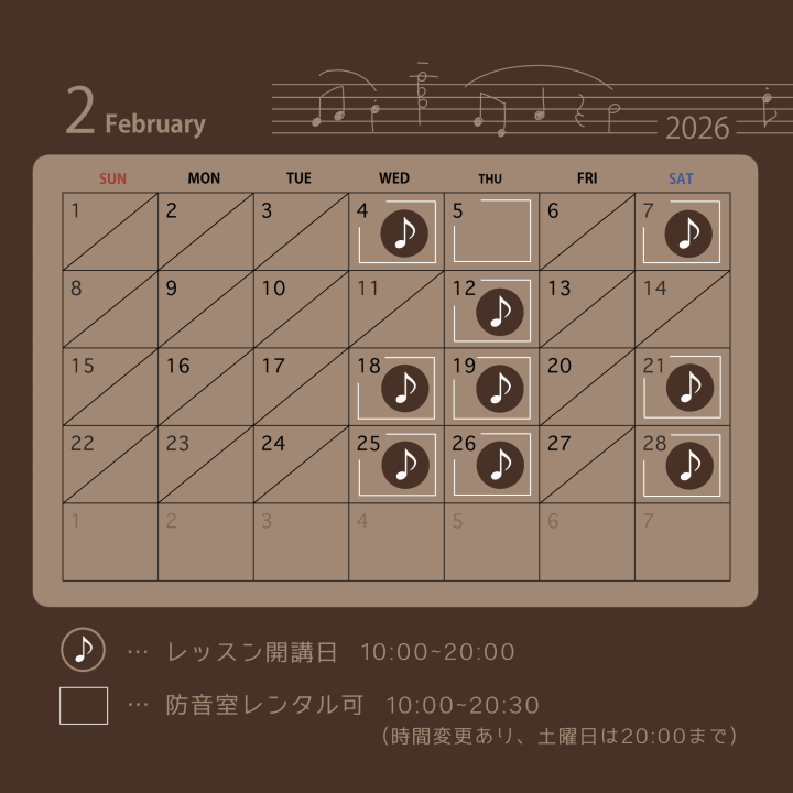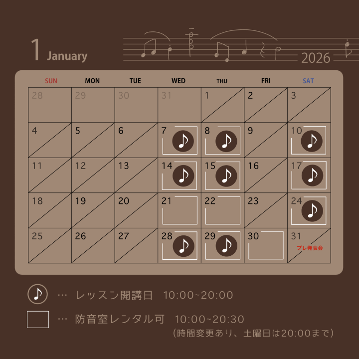 レッスン開講日・防音室レンタル可能日